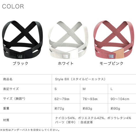 MTG スタイルBX Style BX 3色 モーブピンク ブラック ホワイト S M L 猫背矯正ベルト 姿勢矯正ベルト サポーターJANコード:モーブピンクS 4589760230675 / モーブピンクM 4589760230682 / モーブピンクL 4589760230699 / ブラックS 4589760230453 / ブラックM 4589760230460 / ブラックL 4589760230477 / ホワイトM 4589760234116 / ホワイトL 4589760234123表記サイズ・品番ブラック S(BS-BX2234-S)、M(BS-BX223-M)、L(BS-BX2234-L)モーブピンク S(BS-BX2234-PS)、M(BS-BX2234-PM)、L(BS-BX2234-PL)ホワイト M(BS-BX2234-WM)、L(BS-BX2234-WL)商品サイズ(胸囲※)S 62〜79cm、M 76〜93cm、L 90〜104cm※女性はアンダーバストを目安にしてください。