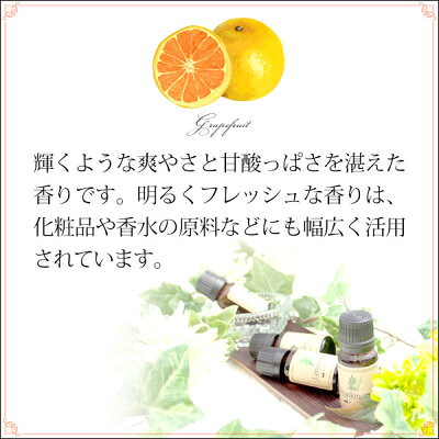 グレープフルーツの詳細(シトラス系) 成分/グレープフルーツ(天然100%エッセンシャルオイル) 容量/10ml 学名 : Citrus paradisi 原産国 : USA 抽出部位 : 果皮 抽出方法 :低温圧搾法 オレンジ・スイートの詳細(シトラス系) 成分/オレンジ・スイート(天然100%エッセンシャルオイル) 容量/10ml 学名 : Citrus sinensis 原産国 : ブラジル 抽出部位 : 果皮 抽出方法 :低温圧搾法 エッセンシャルオイル(アロマオイル)の取扱い注意事項 【精油の取扱い注意事項】 ◆原液のまま肌につけないでください。